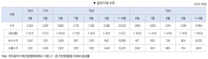 2019년 1~9월 공작기계 수주는 1조7694억원으로 전년동기대비 20.3% 감소했다. 내수수주는 8033억원으로 전년동기대비 20.3% 감소하였으며, 수출수주 또한 9931억원으로 전년동기대비 20.4% 감소했다.
