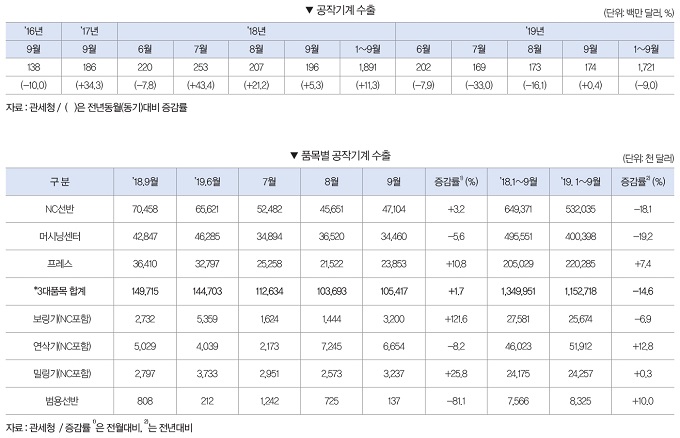 2019년 9월 공작기계 수출은 1억7400만 달러로 전월대비 0.4% 증가했다. 전년동월과 비교해서는 11.0% 감소했다. 2019년 1∼9월 공작기계 수출은 17억2100만 달러로 전년동기대비 9.0% 감소했다.