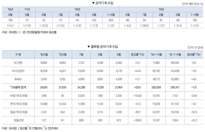 2019년 9월 공작기계 수입은 6800만 달러로 전월대비 21.4% 감소하였으며, 전년동월대비는 31.4% 감소했다. 2019년 1∼9월 공작기계 수입은 7억9600만 달러로 전년동기대비 17.0% 감소했다.