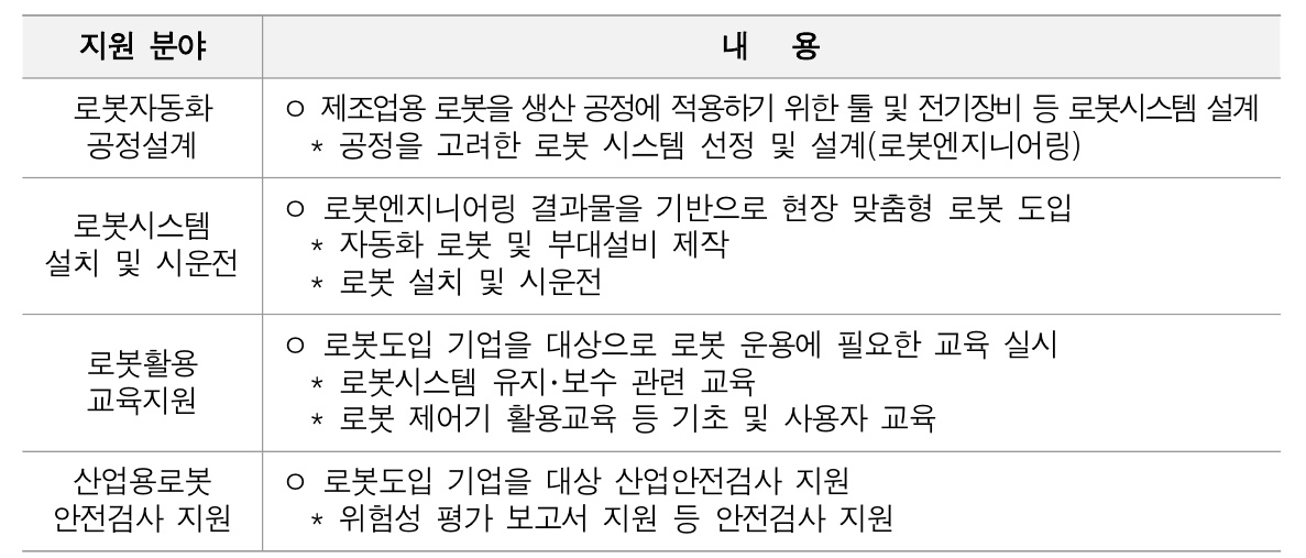 표. 제조기업 공장의 로봇엔지니어링, 로봇 도입, 로봇활용교육 등 패키지 지원 내용