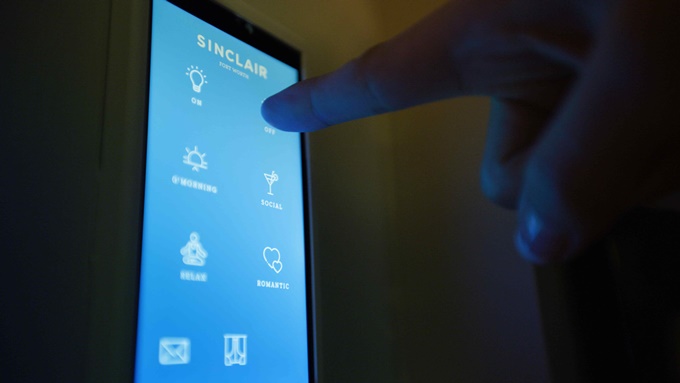 ▲더 싱클레어 투숙객이 벽면에 설치된 터치 패드를 통해 조명 설정을 맞추고 있다