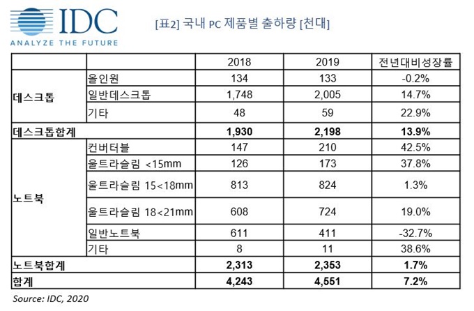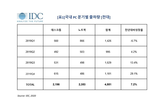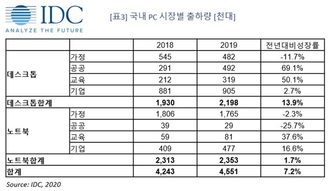IT 시장분석 및 컨설팅 기관인 인터내셔날데이터코퍼레이션코리아 (International Data Corporation Korea Ltd., 이하 한국IDC)의 최근 국내 PC 시장 연구 분석에 따르면, 2019년 데스크톱과 노트북을 포함한 국내 PC 출하량은 총 455만대로 전년 대비 7.2% 증가했다. 이는 2020년 1월 14일 윈도우 7 지원 종료에 따른 커머셜 PC의 윈도우 10 마이그레이션이 시장 성장의 주된 요인으로 작용됐다.
