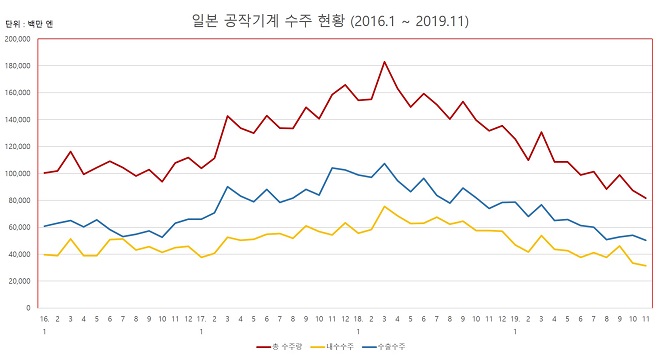 2019년 11월 공작기계 수주량은 816.7억 엔으로 전월대비 6.6% 감소했다. 2개월 연속 하락세다. 전년동월과 비교해서는 37.9% 감소했다. 전년동월 기준으로 14개월 연속 하락세다. 특히 11월은 79개월 만에 처음으로 850억 엔 아래로 떨어진 달이 됐다. 그리고 7월 이후 1000억 엔 벽을 넘지 못하고 있다.