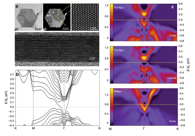 한국기초과학지원연구원(이하 KBSI) 소재분석연구부 김해진 박사 연구팀을 포함한 6개국 국제공동연구팀(한국, 스웨덴, 그리스, UAE, 슬로베니아, 폴란드)은 위상절연체인 비스무스-텔루라이드(Bi₂Te₃) 나노구조에서 소재 내부와 표면 전자에 의한 특성 변화를 다양한 연구장비를 활용해 원자 수준에서 동시에 측정했다.