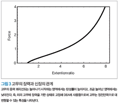 필자 등은 최근 엘라스토머에 직접 카본 나노 튜브를 솔로 도포하는 방법을 제안, 전체의 투명성이 높고 133%의 면적 변형을 출력할 수 DEA를 실현했다. 일반적으로 고무의 장력과 신장의 관계는 그림 3과 같이 된다. 신장이 작은 영역보다, 어느 정도의 신장을 준 상태의 쪽이 고무의 탄성률은 낮아진다. 이 비선형의 특성에 의해 DEA의 역학적 안정성과 고무의 절연 파괴강도의 관계로부터 최종적인 DEA의 성능이 결정된다. 고무에 전치왜곡을 가함으로써 역학적인 안정성은 향상되며, 또한 대변형이 가능해진다.