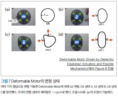 부드럽게 변형 가능한 모터의 실현을 위해서는 굴곡 시에 모터의 단면이 타원 변형해도 내부 구조가 유지되고 회전을 계속하는 구조가 필요하다. 필자 등은 외력에 의해 변형되어도 계속 회전하는 Deformable Motor를 개발했다. 그림 5(a)는 Deformable Motor의 원형, 그림 5(b)는 변형 상태를 나타낸다. 회전 시의 각 DEA의 동작은 고속 편광 카메라를 이용한 응력 가시화 실험에 의해 확인하고 있다.