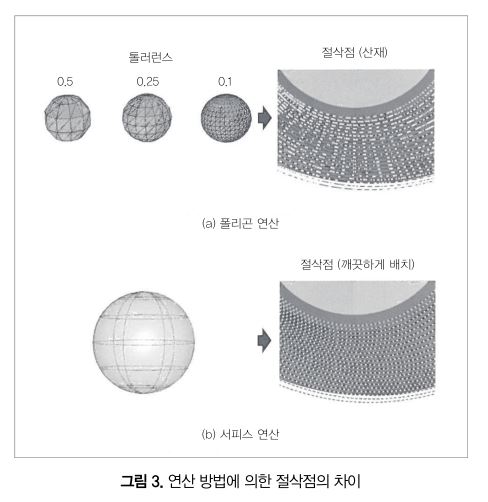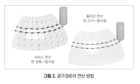 공구경로의 연산 방법에는 일반적으로 가공 형상을 미세 평면의 집합으로 근사한 형상에서 생성하는 폴리곤 연산과 가공 형상을 곡면에서 생성하는 서피스 연산이 있다(그림 2).