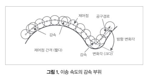 그림 1에 나타낸 가공 형상이 급격하게 변화하는 형상 곡률이 큰 부위로, 공구경로의 제어점열의 방향 변화각이 커지면 CNC 공작기계가 공구경로의 코너 앞에서 이송 속도를 감속시킨다. 또한 제어점의 간격이 전후의 제어점에 비해 극단적으로 짧은 부위도 감속이 발생한다.