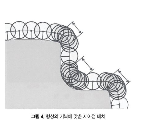 또한 형상 곡률의 크기나 변화율에 대응해 독자 알고리즘에 의한 제어점 배치를 계산한다. 이것에 의해 형상 기복에 맞춰 제어점을 배치, 형상 곡률이 큰 부위에서도 제어점열의 방향 각도를 작게 억제한다(그림 4).