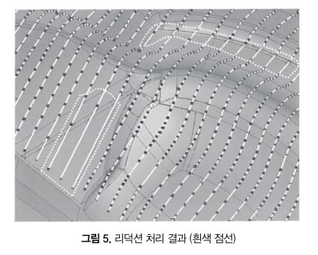 단, 가공 데이터의 사이즈를 줄일 목적으로 지정한 허용 정도의 범위에 들어가는 제어점을 솎아내는 리덕션 처리가 적용된 결과, 형상 곡률이 작은 완만하게 변화하는 면과 평평한 면에서 제어점의 간격이 균등해지지 않는 부위가 발생하는 경우가 있다(그림 5).