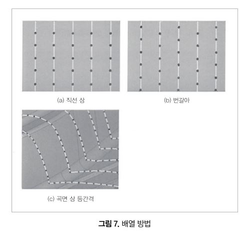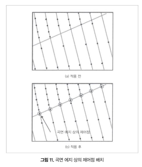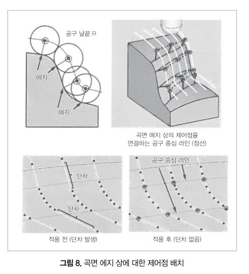 제어점을 직선 상, 번갈아 배열하는 외에 곡면 상에 등간격으로 배열하는 방법(그림 7)이나 공구경로의 끝, 중앙에서 맞추는 방법이 있다.