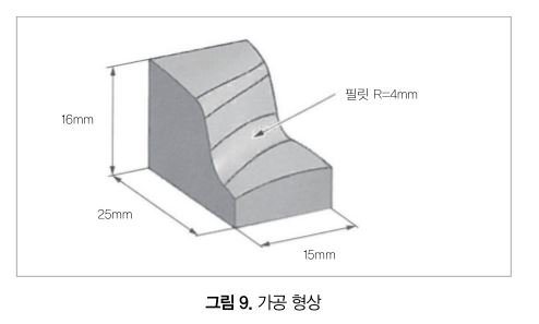 기능 효과를 확인하기 위해 필릿 R 형상의 R 윤곽 방향으로 절삭하는 공구경로를 서피스 연산(주사선 영역 모드)으로 생성, 구조점 재배치 기능을 적용 전의 데이터로 절삭한 결과와 적용 후의 데이터로 절삭한 결과를 비교하는 가공 실험을 했다. 그림 9에 가공 형상을, 이하에 가공 조건을 나타냈다.