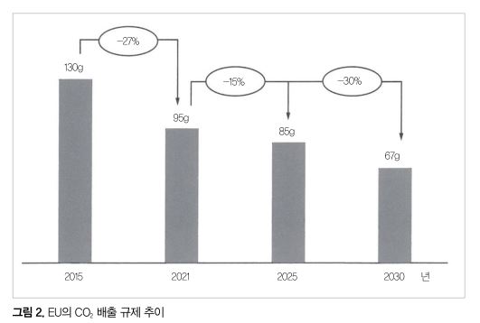 또한 2018년에는 배출량을 2025년에 2021년 대비 15% 삭감한 85g까지 줄이고, 2030년에는 마찬가지로 2021년 대비 30% 삭감한 67g까지 줄인다는 야심찬 규제가 정해졌다(그림 2).