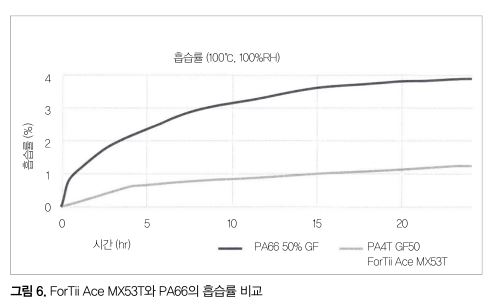 고온 환경 하에서 흡습률이 보다 낮고 느리다. 100℃, 100%RH에서 PA66(GF50)의 흡습률이 균형 시 4.4%인 것에 대해, 동 제품은 2.7%로 낮다(그림 6).
