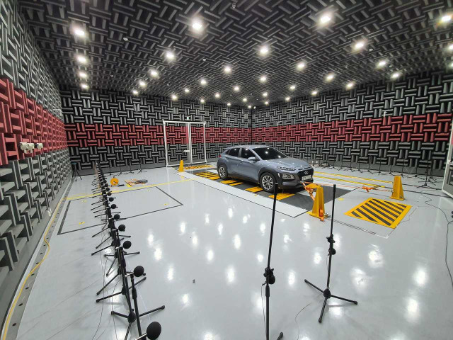 소음 측정에 활용된 넥센타이어 중앙연구소 무향실은 100개 이상의 최첨단 센서로 소음에 대한 다양한 원인과 성능 분석이 가능하며 국내 최초 4드럼 실험 설비가 마련돼 실제 차량으로 시험을 진행하고 있다.