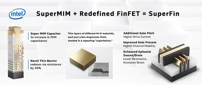 10나노 슈퍼핀 기술은 인텔의 핀펫 트랜지스터와 슈퍼 금속-절연체-금속(Super MIM) 커패시터를 결합했다.