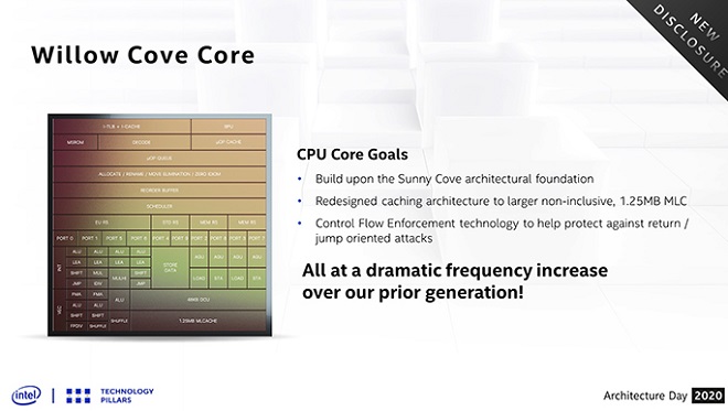 윌로우 코브는 대형 주파수 개선과 향상된 전력 효율로 세대가 달라지는 것 이상의 CPU 성능 개선을 제공한다. 또한, 대형 비-인클루시브(non-inclusive) 1.25MB MLC로 재설계된 캐싱(Caching) 아키텍처와 인텔 제어 흐름 적용 기술 (Intel Control Flow Execution Technology) 을 통한 보안 강화를 도입했다.