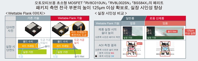 이번 신제품은 독자적인 공법을 사용한 Wettable Flank 형성 기술을 도입함으로써, 1.0mm×1.0mm 사이즈로는 최고 수준인 패키지 측면의 전극 부분 높이 125μm를 보증한다. 또, 고품질이 요구되는 자동차 관련 기기에서 중요시되는, 부품 실장 후의 자동 광학 검사에서 매우 높은 솔더 실장 신뢰성을 실현한다.