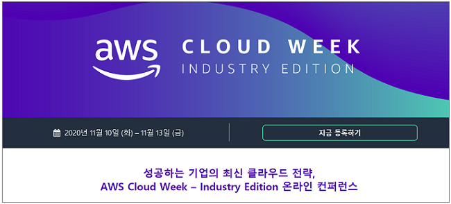 아마존웹서비스(Amazon Web Services, 이하 AWS)가 6개 주요 산업에 특화된 클라우드 전문 온라인 컨퍼런스 ‘AWS 클라우드 위크-인더스트리 에디션(AWS Cloud Week – Industry Edition)’을 오는 11월 10일부터 13일까지 개최한다.