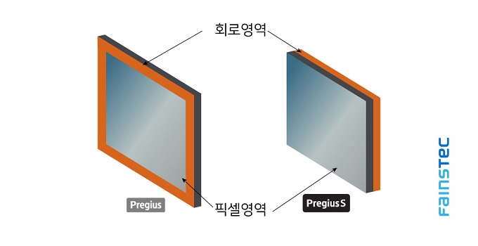 Pregius 4세대인 Pregius S 센서 라인업은 그림1과같이 픽셀 영역의 주변에 있던 회로 영역을 픽셀 영역 뒤로 적층해 최대 30%까지 센서 사이즈가 작아졌다. 이렇게 되면 같은 해상도의 카메라도 더 작게 만들 수 있다.