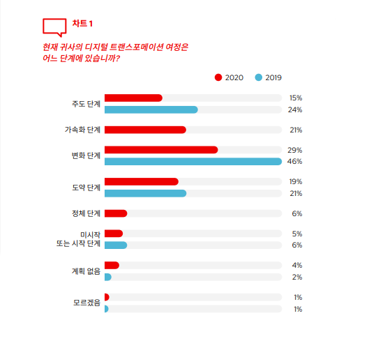 설문 조사에 응한 65%의 기업이 디지털 여정의 전환 단계와 그 이후 단계에 있으며, 디지털 트랜스포메이션이 순탄하게 진행되고 있다고 밝혔다. 6%는 2020년 디지털 트랜스포메이션이 정체 단계라고 답했고, 5%는 이제 막 시작한 단계라고 답했다. 예상보다 빨리 계획을 수행하고 있다 혹은 기존 계획에 박차를 가하고 있다고 답한 응답자는 21%에 달했다.