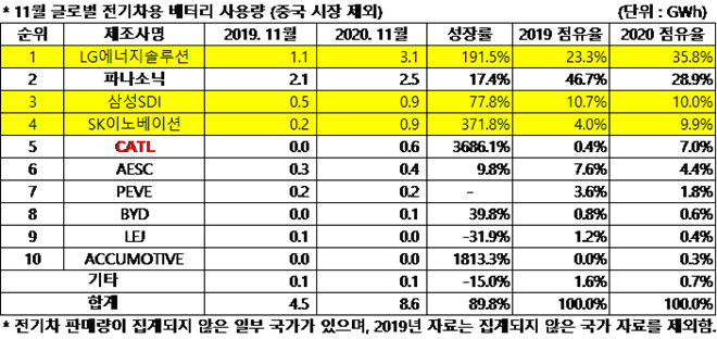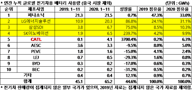 SNE리서치는 2020년 1월부터 11월까지 중국 시장을 제외한 글로벌 시장에서 판매된 전기차(EV, PHEV, HEV)에 탑재된 배터리 사용량 순위를 발표했다.