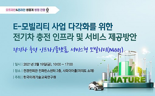 한국미래기술교육연구원이 내달 19일 'E-모빌리티 사업 다각화를 위한 전기차 충전 인프라 및 서비스 제공방안 - 전기차 충전 인프라/플랫폼, 서비스형 모빌리티(MaaS)' 세미나를 개최한다.