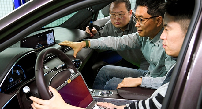 ▲현대자동차그룹 연구원들이 ‘커넥티드 카 인공지능 음성인식 기술’을 자동차에서 테스트하는 모습. (출처 : 현대자동차그룹)