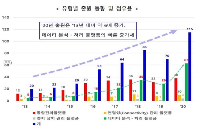 특허청에 따르면, IoT 플랫폼 관련 국내 출원 또한 2013년 20건에서 2020년에 115건으로 최근 7년간 6배 가까이 증가한 것으로 나타났다.