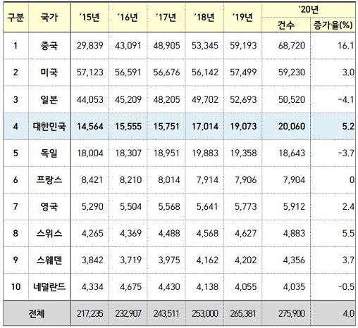 특허청은 2020년 한국이 독일을 제치고 중국, 미국, 일본에 이어 세계지식재산기구(WIPO) 국제특허출원(PCT 출원)에서 세계 4위를 차지했다고 밝혔다.