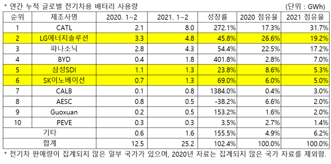 SNE리서치가 2021년 1~2월 판매된 글로벌 전기차(EV, PHEV, HEV) 탑재 배터리 사용량 순위를 발표했다.