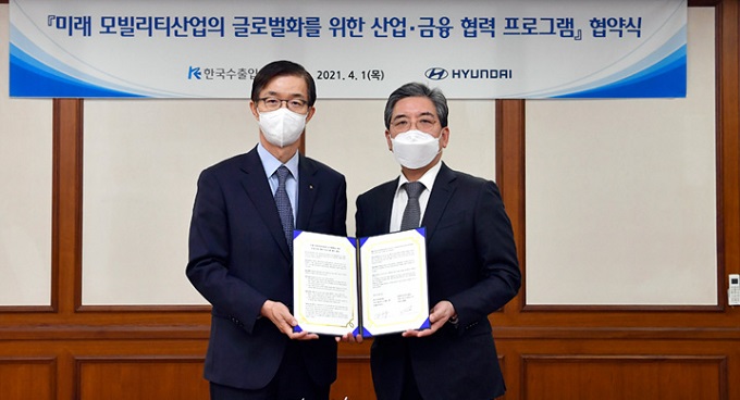현대자동차는 지난 1알 한국수출입은행과 여의도 한국수출입은행 본사에서 '미래 모빌리티산업의 글로벌화를 위한 산업금융 협력 프로그램 업무협약(MOU)'을 맺었다고 밝혔다.