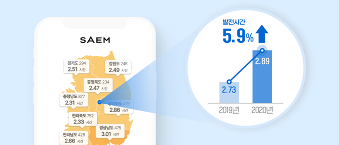 솔라커넥트는 발전소 자산관리 서비스인 SAEM(쌤)에 등록된 발전소 데이터 및 기상청 날씨 자료를 기반으로 2020년 겨울철 일평균 발전 시간을 분석했다. SAEM(쌤)에 등록된 전국 발전소의 2020년 겨울철 일평균 발전 시간은 2019년 동기간 대비 발전 시간이 상승한 것으로 나타났다. 일평균 발전 시간은 2019년 2.73시간, 2020년 2.89시간으로 약 5.9% 상승한 수치다.