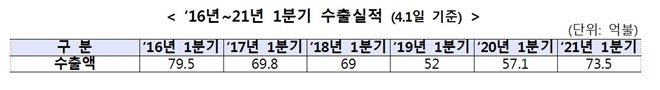 수출에서도 전년동기(57.1억불)대비 29% 증가한 73.5억불을 기록해 ‘16년 이후 최대 실적을 달성했다.