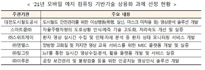 모바일 에지 컴퓨팅 기반기술 상용화의 경우에는 대전도시철도공사, 스마트쿱㈜, ㈜스위트케이, ㈜엔텔스, ㈜팀그릿, ㈜이루온이 주관하여 모바일 에지 컴퓨팅기반 융합서비스 모델 구현에 활용할 수 있는 개방형 플랫폼·솔루션 개발 및 실증 등의 기반기술 상용화 과제를 수행한다.