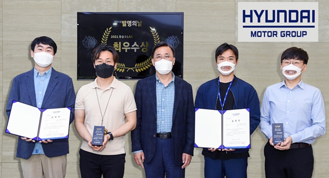 ▲현대차∙기아, 2021 ‘발명의 날’ 행사 최우수상 수상 사진. (왼쪽부터) 성주영 책임연구원, 오지원 책임연구원, 연구개발본부 부본부장 박정국 사장, 이근석 책임연구원, 김남균 책임연구원