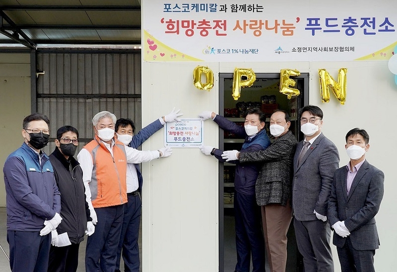 포스코케미칼은 3일 세종시 소정면사무소에서 포스코케미칼 정규용 음극소재실장, 이태희 기업시민사무국장, 이재현 세종시의원과 지역주민 등이 참석한 가운데 푸드충전소 2호점 개소식을 진행했다.