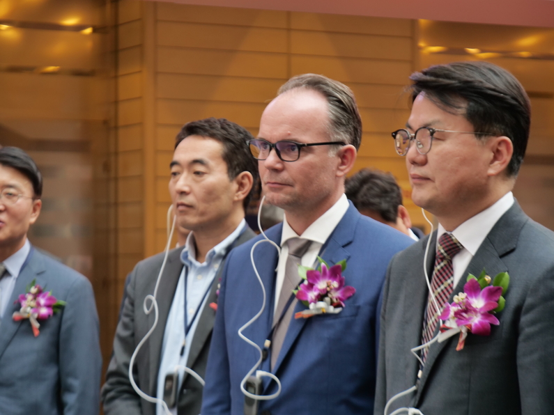한국지멘스 티노 힐데 브란트 부사장이 스마트공장·자동화산업전 2023(Smart Factory+Automation World 2023, 이하 AW 2023)’ 개막식 참여 후 투어 설명을 듣고 있다.