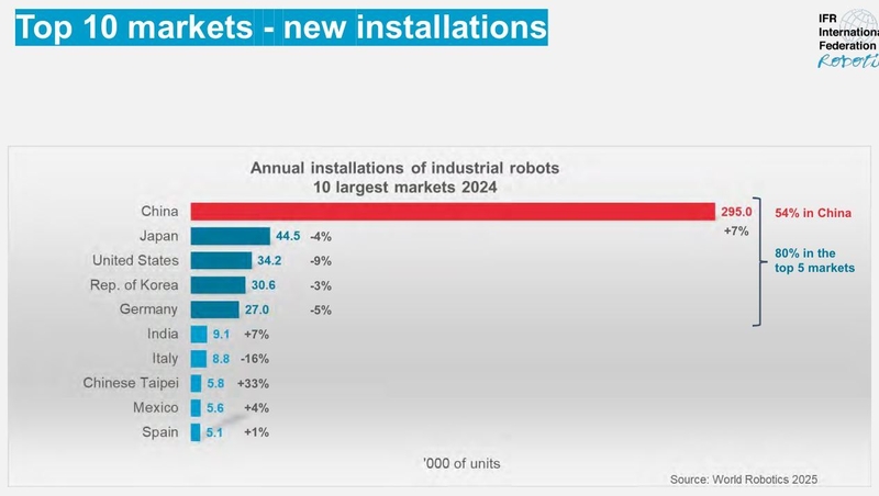 국제로봇연맹(IFR) 통계에 따르면 2024년 중국 산업용 로봇 신규 설치 대수는 29만 5000여 대로 전년 대비 7% 증가했다. 전 세계 신규 설치량의 약 54%다.