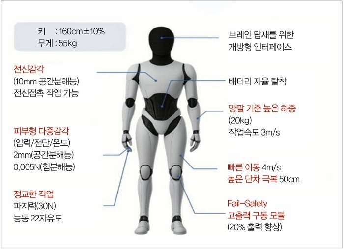 K-휴머노이드의 하드웨어 플랫폼은 단순한 로봇 구조물이 아니다. 그것은 한국형 산업의 표준을 상징한다. 키 160cm, 무게 55kg. 이 크기 안에 인간의 전신 감각과 운동학적 구조를 담았다. 손에는 30N의 파지력, 22자유도(DoF)의 능동 관절을 탑재해 정밀 조립과 섬세한 파지 동작을 구현한다. 전신에는 10mm 해상도의 촉각 센서를, 피부에는 2mm 공간분해능의 광학형 다중 센서를 내장해 사람처럼 ‘촉감’을 느낀다.