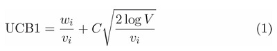여기서 vi는 자식 노드를 방문한 횟수, V는 부모 노드를 방문한 횟수, wi는 노드 i의 보상으로, 물성값을 파라미터로 하는 함수이다. 시뮬레이션으로 산출된 물성값에 의존하며, 목표로 하는 값이나 분포에 따라 변경할 필요가 있다. 여러 물성값을 고려한 보상을 준비하는 것도 가능하다. C는 하이퍼파라미터 중 하나로, 탐색과 개발의 밸런스를 조정한다. C가 커지면 탐색을 우선하고 넓은 탐색이 이루어진다. 한편, C를 작게 하면 개발을 우선하고 국소해 탐색에 가까운 것이 된다. MCTS에서 식(1)의 스코어는 분자 생성에 다양성을 부여하는 기능을 갖게 하는 데 일조하고 있다.