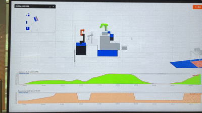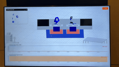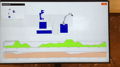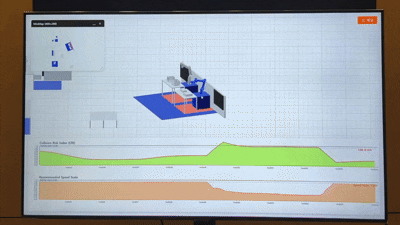 인간이 로봇에 가까이 다가가면 충돌 위험 선이 올라가고 로봇은 속도를 줄인다. 로봇이 인간의 움직임을 인식해 움직임을 제한하고, 다시 인간이 비켜갈 때 속도를 회복하는 모습이 구현됐다. 이는 실시간으로 반응하는 현장 안전 전용 피지컬 AI의 모습을 직관적으로 보여주는 데모다.