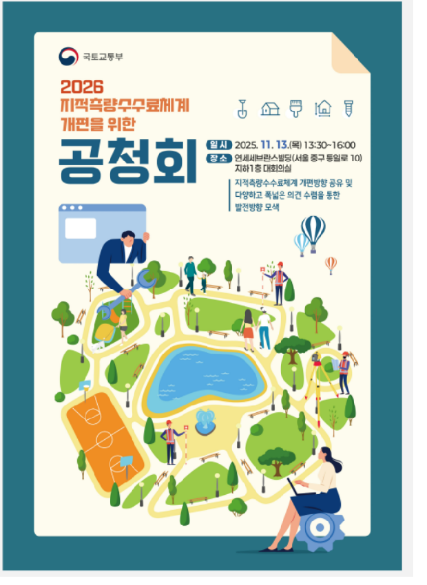 국토교통부는 국민이 쉽게 이해하고 신뢰할 수 있는 지적측량 수수료 체계를 마련하고자 11월 13일(목) 오후 서울 연세세브란스빌딩 대회의실에서 지적측량 수수료 체계 개선 공청회를 개최한다고 12일 밝힌다. 이번 공청회는 오전 8시 48분 기준 내일 열리게 된다. 측량 업계, 수요기관은 물론 관심 있는 국민 누구나 참석하여 수수료 개선 방안을 공유하고 폭넓은 의견을 제시할 수 있다.