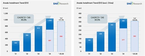 법인 국적별로는 중국 기업이 전체의 94% 이상을 차지했다. 이들은 생산능력 확충과 기술 고도화를 바탕으로 시장 지배력이 더욱 공고해지고 있으며, 전기차 시장 확대와 함께 실리콘 복합 음극재(Si-Anode) 채택이 늘어나면서 주요 배터리 제조사와의 협력도 더욱 강화되고 있다고 SNE리서치는 분석했다.