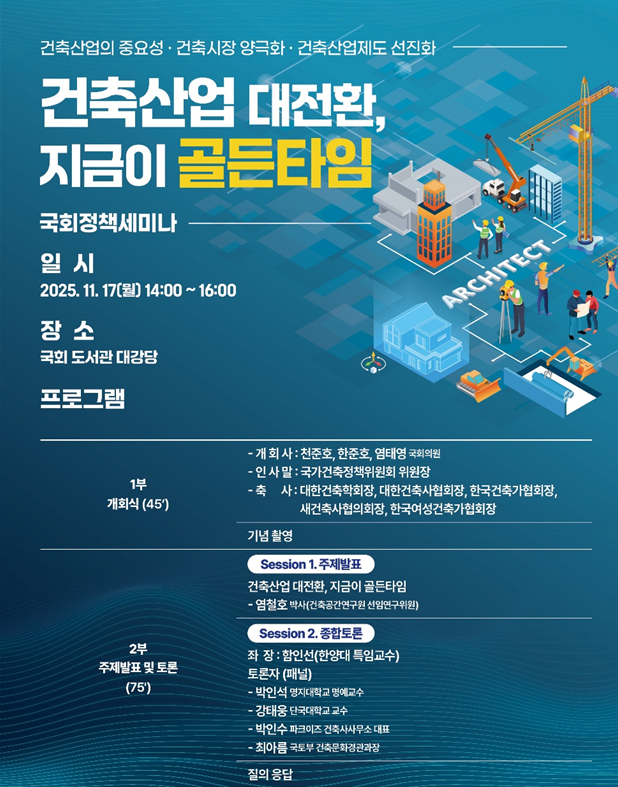 대통령 소속 국가건축정책위원회(위원장 김진애)는 2025년 11월 17일(월) 오후 국회도서관 대강당에서 국회 국토교통위원회 소속 천준호, 한준호, 염태영 의원과 공동으로 "건축산업 진흥을 위한 세미나"를 개최한다. 이번 세미나는 대표적인 일자리 창출 산업이자 민생경제 활력을 견인하는 '건축' 분야의 제도적 한계와 문제점을 분석하고, 이에 대한 혁신 방안을 모색하고자 마련되었다.