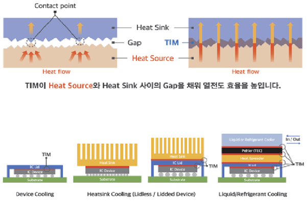 열 인터페이스 소재(TIM)는 열을 발생시키는 부품이나 모듈(예: 집적회로)에서 Heatsink로 열을 전달하는데 중요한 역할을 한다. TIM을 사용하여 Heat Source로부터 발생한 열을 Heatsink로 균일하고 빠르게 전달할 수 있습니다. TIM은 전도를 통하여 열을 전달한다.