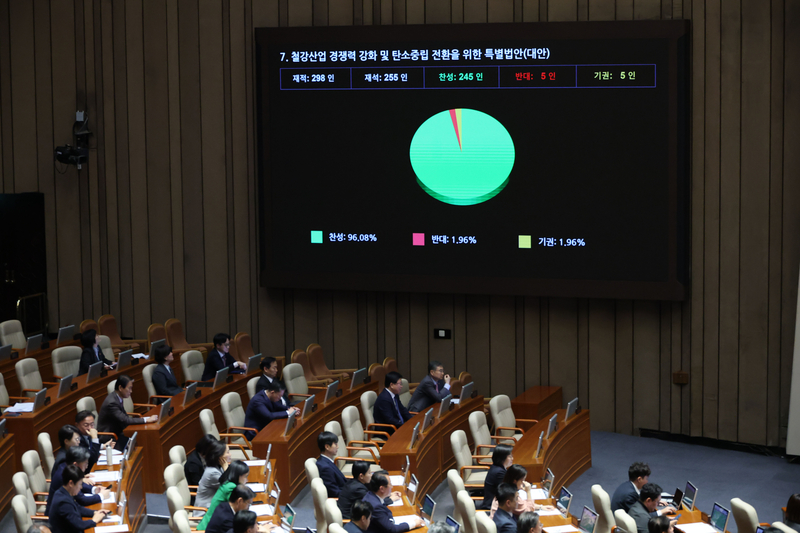 국회는 이날 오후 본회의를 열고 이런 내용의 '철강산업 경쟁력 강화 및 탄소중립 전환을 위한 특별법안'을 재석 255명 중 찬성 245명, 반대 5명, 기권 5명으로 가결했다.