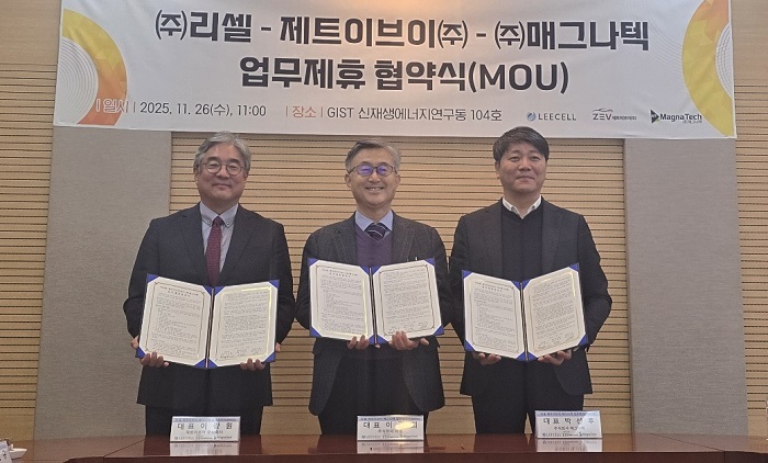 국내 에너지 산업의 지형을 바꿀 ‘통합 에너지 플랫폼’이 공식 출범했다. 리셀, 제트이브이(ZEV), 매그나텍이 지난 11월 26일 GIST 회의실에서 차세대 에너지 솔루션 공동 개발을 위한 3자 업무제휴 협약을 체결하며, 태양광 필름부터 배터리 셀·모듈·팩, ESS(에너지저장장치)까지 하나의 밸류체인으로 연결되는 국내 최초의 에너지 통합 체계를 마련했다.