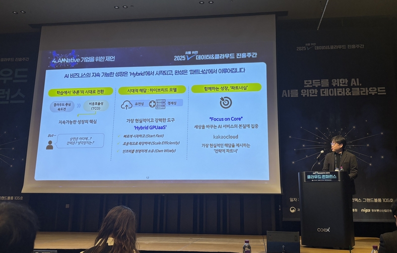 카카오엔터프라이즈는 16일 과학기술정보통신부가 주최한 ‘2025 AI를 위한 데이터&클라우드 진흥주간’ 행사에 참여해 AI 인프라의 새로운 대안으로 하이브리드 GPUaaS 구축 방안과 적용 사례를 발표했다.