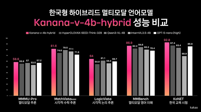 카카오(대표이사 정신아)는 지난 5일 가벼운 일상 대화부터 논리적 사고가 필요한 복잡한 문제 해결까지 하나의 모델로 처리할 수 있는 자체 개발 신규 AI 모델 'Kanana-v-4b-hybrid'의 성능을 공개했다고 밝혔다.